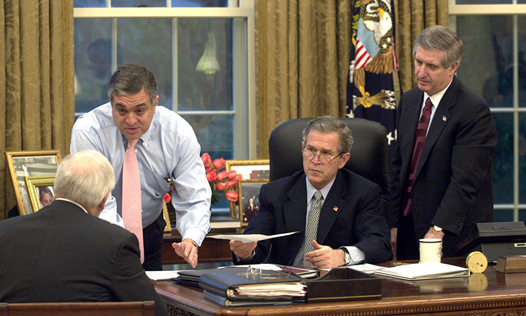In this handout image provided by the White House, President Bush, second from right, receives an update on the status of military action in Iraq Thursday, March 20, 2003 in the Oval Office of the White House. From left are, Vice President Dick Cheney, back to camera, CIA Director George Tenet, the president and Chief of Staff Andy Card. (AP Photo/Eric Draper, White House)